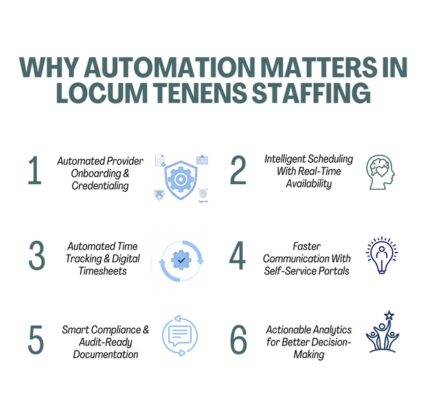 This blog explores how locum automation and digital tools are reshaping the locum tenens landscape—making workflows more efficient, compliance more reliable, and operations more scalable for agencies of all sizes.