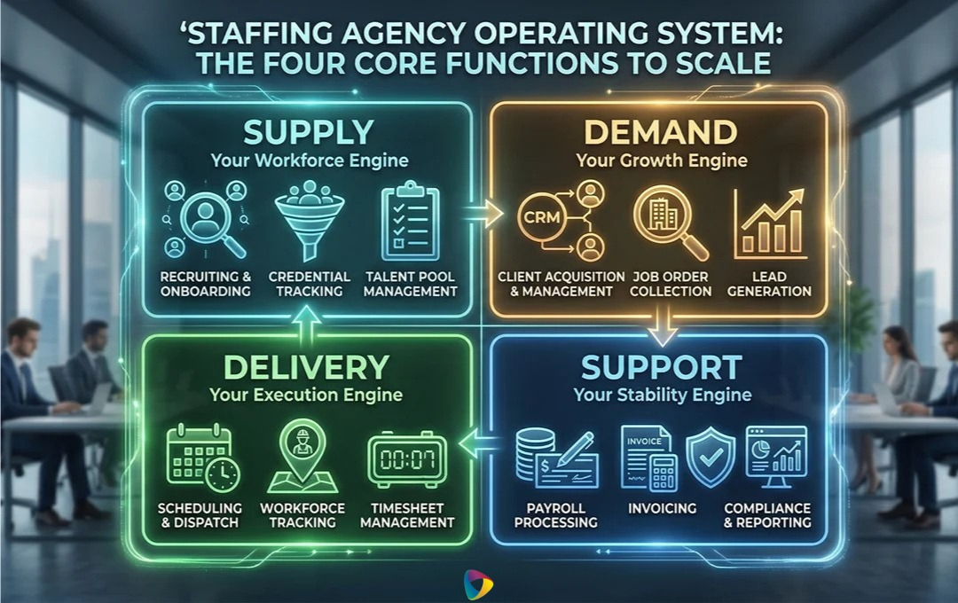 Almost every problem in staffing agency operations links to four core functions: Supply, Demand, Delivery, and Support. When these functions operate together as a system, agencies grow efficiently. When even one falls behind, it creates friction across the entire business.