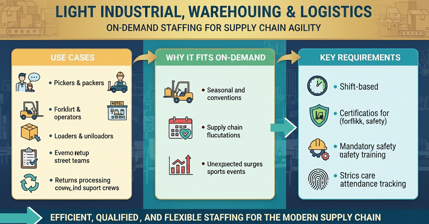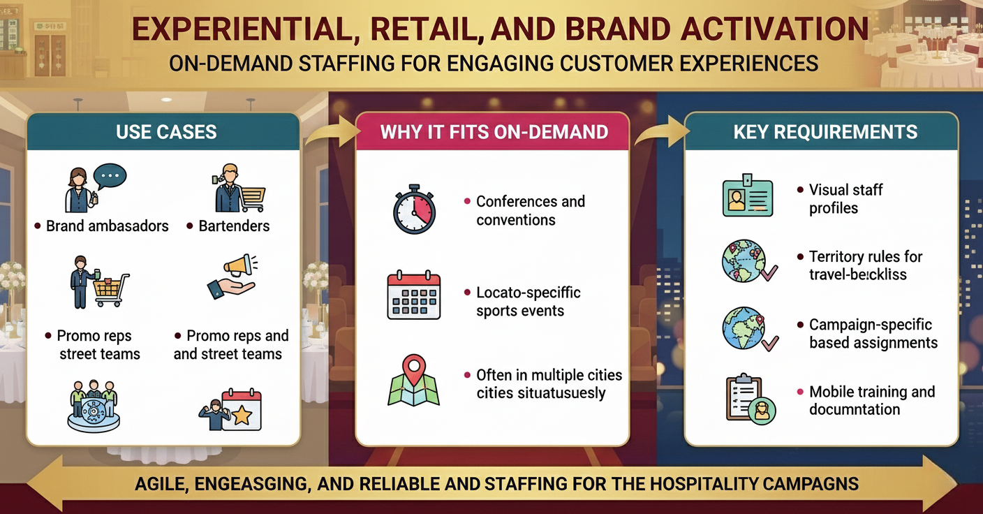 Education, healthcare (PRN/per diem), hospitality, events, retail, light industrial, logistics, and corporate support roles benefit the most. 4. How is on-demand staffing different from traditional temp staffing?