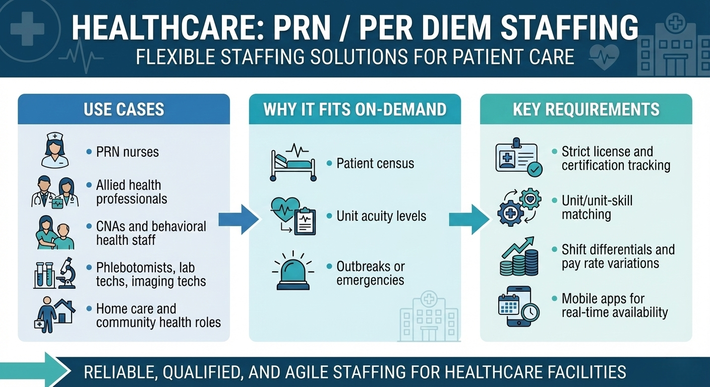 Staffing software enables digital scheduling, credential tracking, time capture, payroll integration, and real-time visibility for clients and workers. 6. Is on-demand staffing suitable for regulated industries like healthcare?